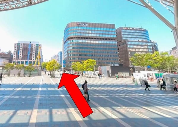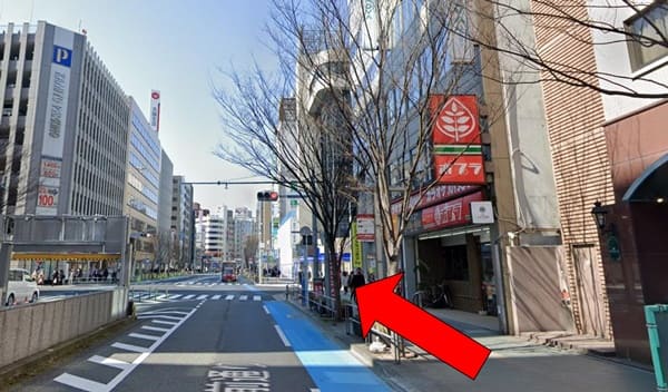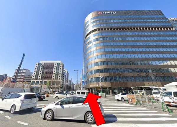 楽天ビルの前まで来たら横断歩道を渡ります。