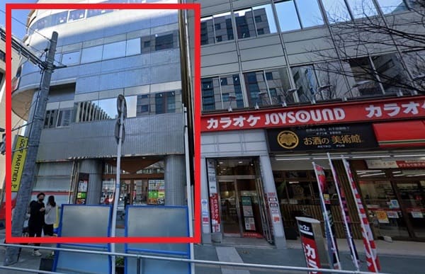 ポプラの20mほど先に赤枠で囲った博多マルイトビルがあります。