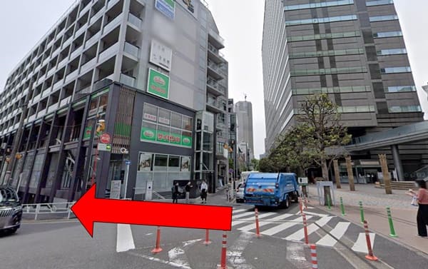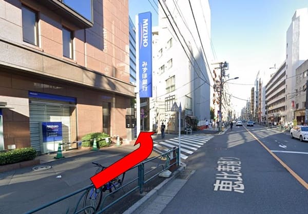 まずは横断歩道を渡って通りの反対側に行き、次にみずほ銀行の方に向かって歩きましょう。