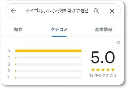 ちなみに参考までに、マイゴルフレンジ福岡けやき通り店のGoogleマップでの口コミ分布がこちら。
